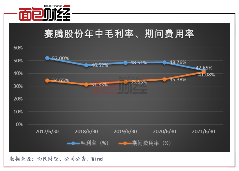 然而2021年上半年,赛腾股份的毛利率下滑明显,且大幅增加的财务费用抬高了公司期间费用率。当期,公司总体毛利率为42.65%,同比下降6.11个百分点。期间费用率为41.08%,同比上升5.70个百分点,主要系财务费用大幅同比增加622.83%至2576.83万元。报告期间,公司发生汇兑净损失634.54万元,较上年同期增加1431.58万元,原因主要为公司外销收入占主营业务收入的比例较高,而当期人民币出现升值。