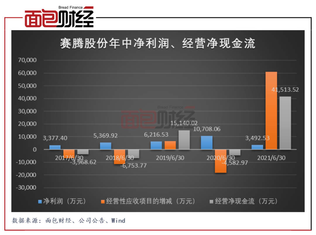 2021年上半年,赛腾股份经营净现金流为4.15亿元,同比增加逾10倍,也显著高于当期公司净利润,主要系期间应收账款的大量回收。报告期末,公司的应收账款余额为6.96亿元,较期初余额减少6.96亿元。当期,公司收回或转回应收账款坏账准备1611.22万元。2017年至2021年,公司上半年的经营净现金流与净利润持续背离,主要受经营性应收项目的增减影响。
