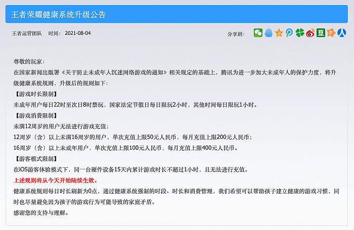 8月4日,王者荣耀在其官网发布《健康系统升级公告》。文中指出,腾讯为进一步加大未成年人的保护力度,将升级健康系统规则。该规则在游戏时长、消费、游客模式方面都有明确限制。