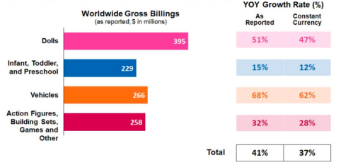 玩偶类产品依然是最大的营收来源,带来3.95亿美元的收入,同比增长47%,其中包括芭比娃娃、美国女孩、波莉口袋和六月推出的环球精灵。