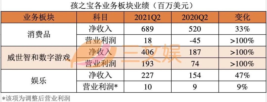 从业务板块来看,各个部门业绩的增长构成了公司总营收54%的涨幅。冠以孩之宝自有品牌、合作品牌以及新兴品牌的消费品销售依然是公司的主要来源,第二季度净收入6.89亿美元,同比增长33%,其中包含190万美元的外汇正面影响,将其剔除后,同比增长29%。高营收抵消了昂贵的版税和广告费用,促使营业利润由负转正,本季度利润率上涨1130个百分点。