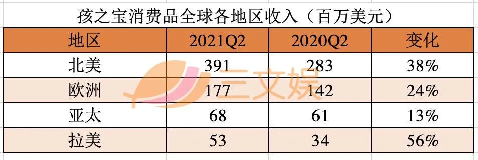 孩之宝的消费品在北美、欧洲、亚太和拉美地区销售。在本季度,上述四个市场的销量都实现了两位数的增长。北美是消费品最主要的市场,收入3.91亿美元。令人意外的是拉美增长56%,成为本季度增幅最大的市场。