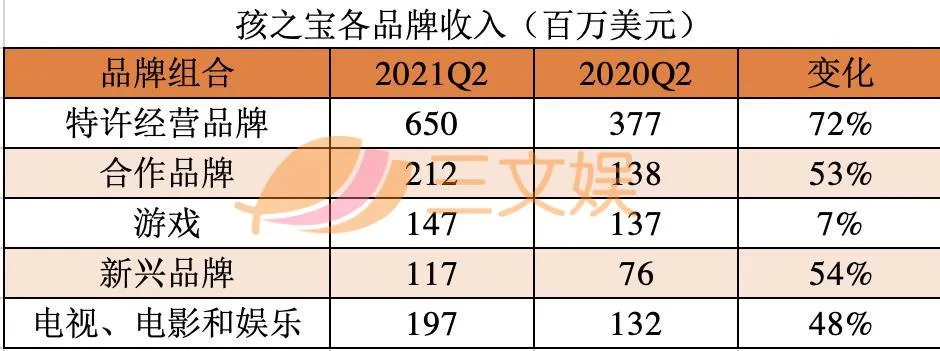 从孩之宝整体的品牌组合来看,特许经营品牌即孩之宝的自有品牌的增幅大大超过其他几种品牌组合。
