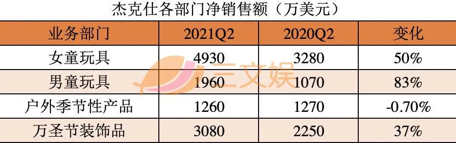 另一家玩具公司杰克仕太平洋也在本季度卖出了好成绩:净销售额1.124亿美元,同比去年增长43%,即便相比于受疫情影响前的2019年同期,增长18%。毛利率28.4%,较2020年第二季度增长710个基点,达到2016年以来的第二季度毛利率的最高水平。