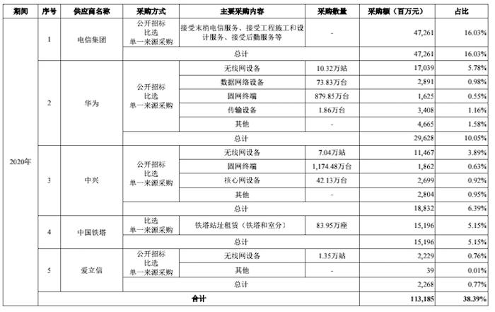 招股书显示,浩瀚深度2020年依靠中国移动收入3.22亿元,占总收入87.91%。与浩瀚深度不同的是,2020年中国电信年报中,华为位列中国电信五大供应商之一,采购额296.28亿元,占总采购金额的10.05%,二者显然不在一个规模。