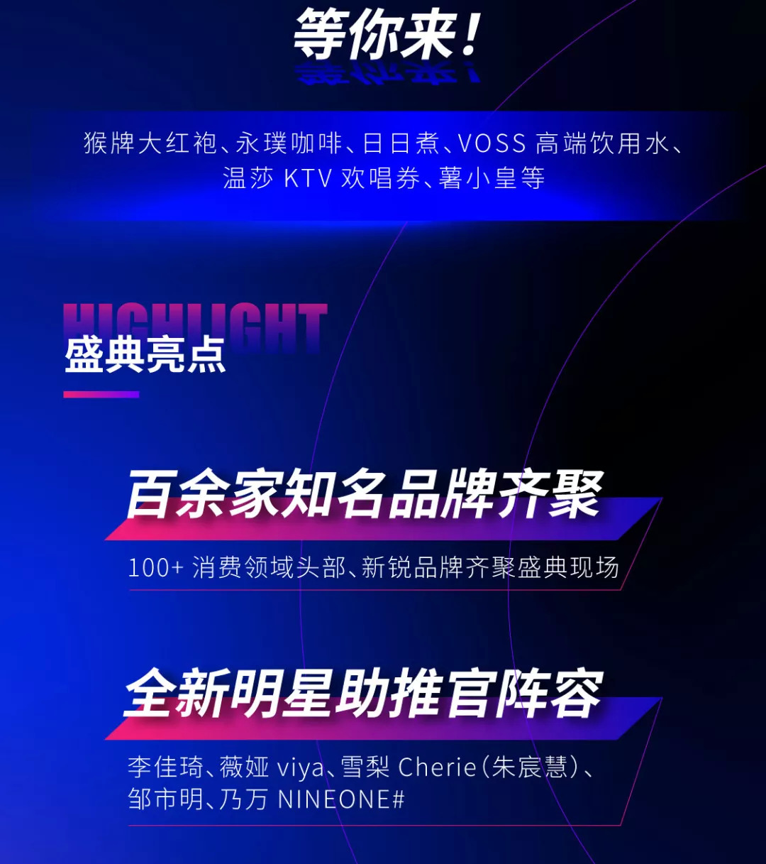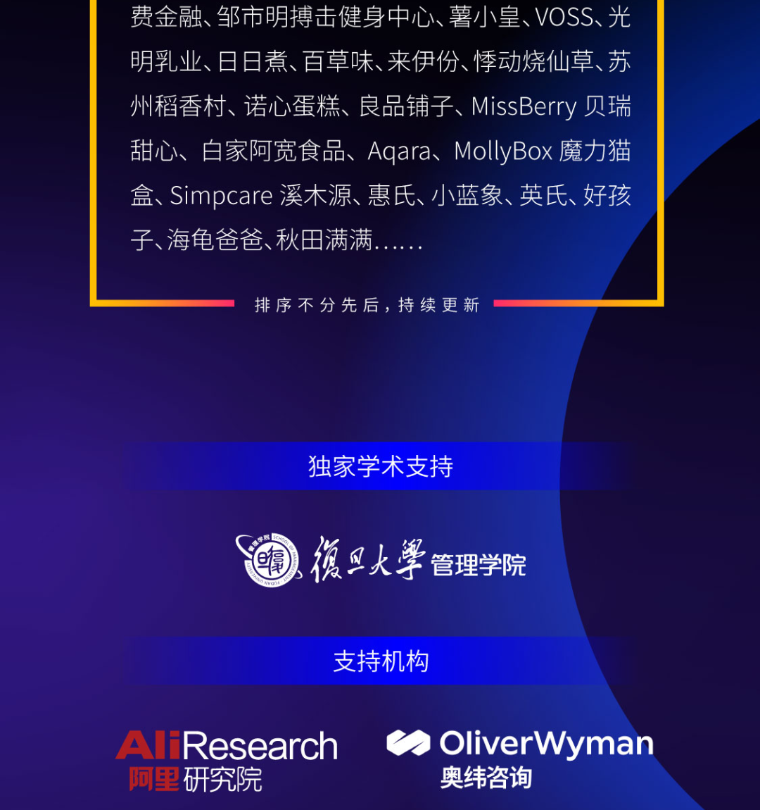 届时,复旦大学管理学院、嘉御基金、阿里研究院、奥纬咨询、哔哩哔哩、阳狮电商、网商银行、永璞咖啡、川娃子、莫小仙、邹市明拳击健身中心、好特卖HotMaxx、悸动烧仙草、魔力猫盒、植物标签、绿米联创、支付宝、百胜中国、波司登、伊利、唯品会、益海嘉里金龙鱼、中国飞鹤、雅诗兰黛、西门子家电、特步等100+顶级、新锐品牌将悉数到场!
