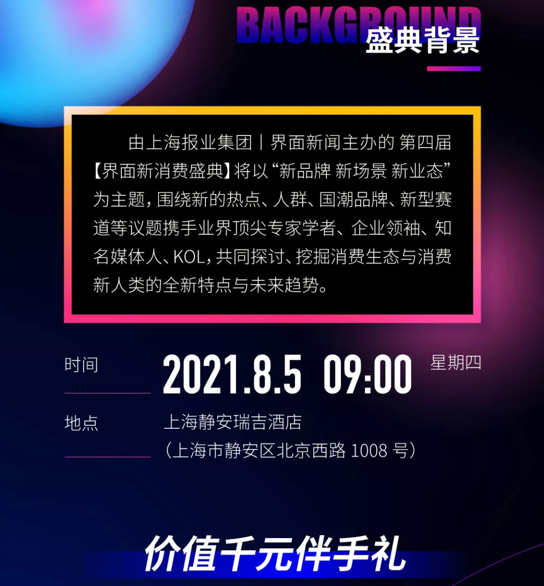 2021年8月5日(星期四)由上海报业集团l界面新闻主办的2021第四届【界面新消费盛典】诚邀社会各界前来参会!