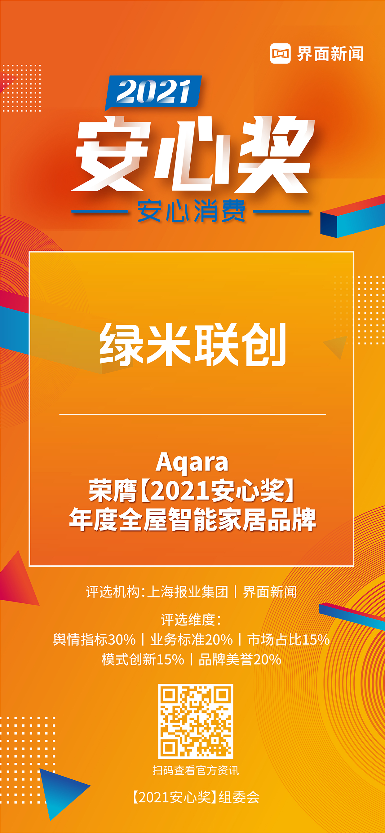 8月5日,上海报业集团|界面新闻在上海静安瑞吉酒店举办了【2021安心奖】颁奖典礼,并正式公布了本年度获奖名单。围绕“安心消费”这一核心价值,来自生活服务、家电、家化、美妆护肤、食品、乳品、饮品等领域优秀企业,突破重围,斩获年度大奖Top40。Aqara以其对科技生活的无限探索和持之以恒关心用户的服务理念,荣膺年度全屋智能家居品牌。