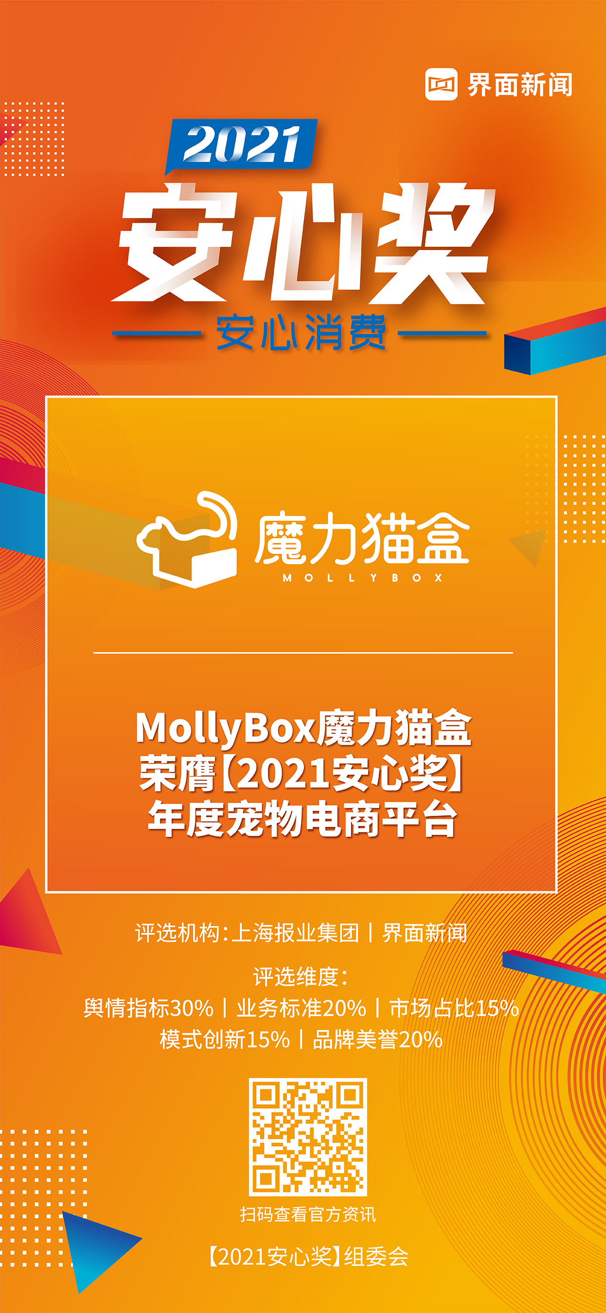 8月5日,上海报业集团|界面新闻在上海静安瑞吉酒店举办了【2021安心奖】颁奖典礼,并正式公布了本年度获奖名单。围绕“安心消费”这一核心价值,来自生活服务、家电、家化、美妆护肤、食品、乳品、饮品等领域优秀企业,突破重围,斩获年度大奖Top40。MollyBox魔力猫盒以其安全可靠的产品与专业的服务,荣膺年度宠物电商平台大奖。