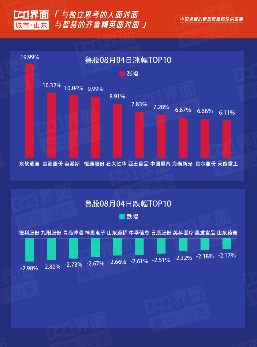 8月4日,山东省内沪深股票有140只个股上涨,95只个股下跌;总市值过千亿的有万华化学(600309)、海尔智家(600690)、潍柴动力(000338)、中航沈飞(600760)、歌尔股份(002241)、青岛啤酒(600600)、华熙生物(688363)共7家,500亿-1000亿的共有9家,分别是山东黄金(600547)、兖州煤业(600188)、华鲁恒升(600426)、中泰证券(600918)、南山铝业(600219)、玲珑轮胎(601966)、联泓新科(003022)、国瓷材料(300285)、睿创微纳(688002)。