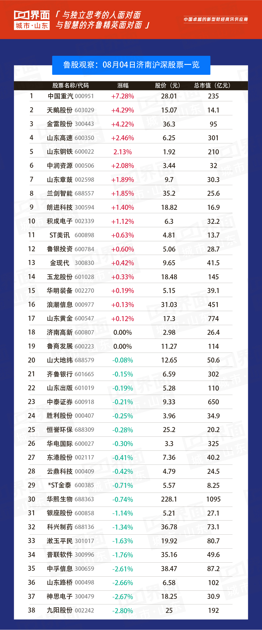 济南市涨幅榜首:中国重汽(000951),涨幅7.28%,股价28.01元,总市值235亿元;