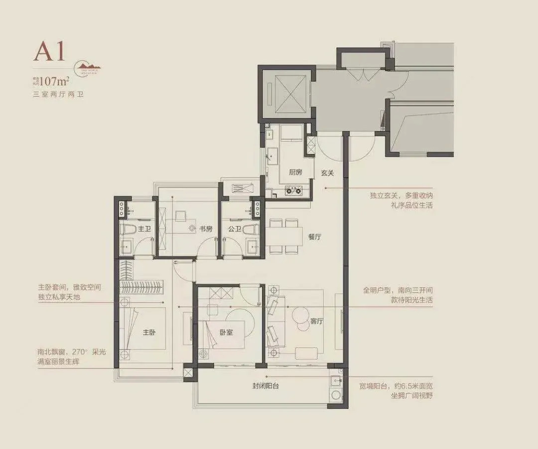 建筑面积约107㎡户型图(三室两厅两卫)↓