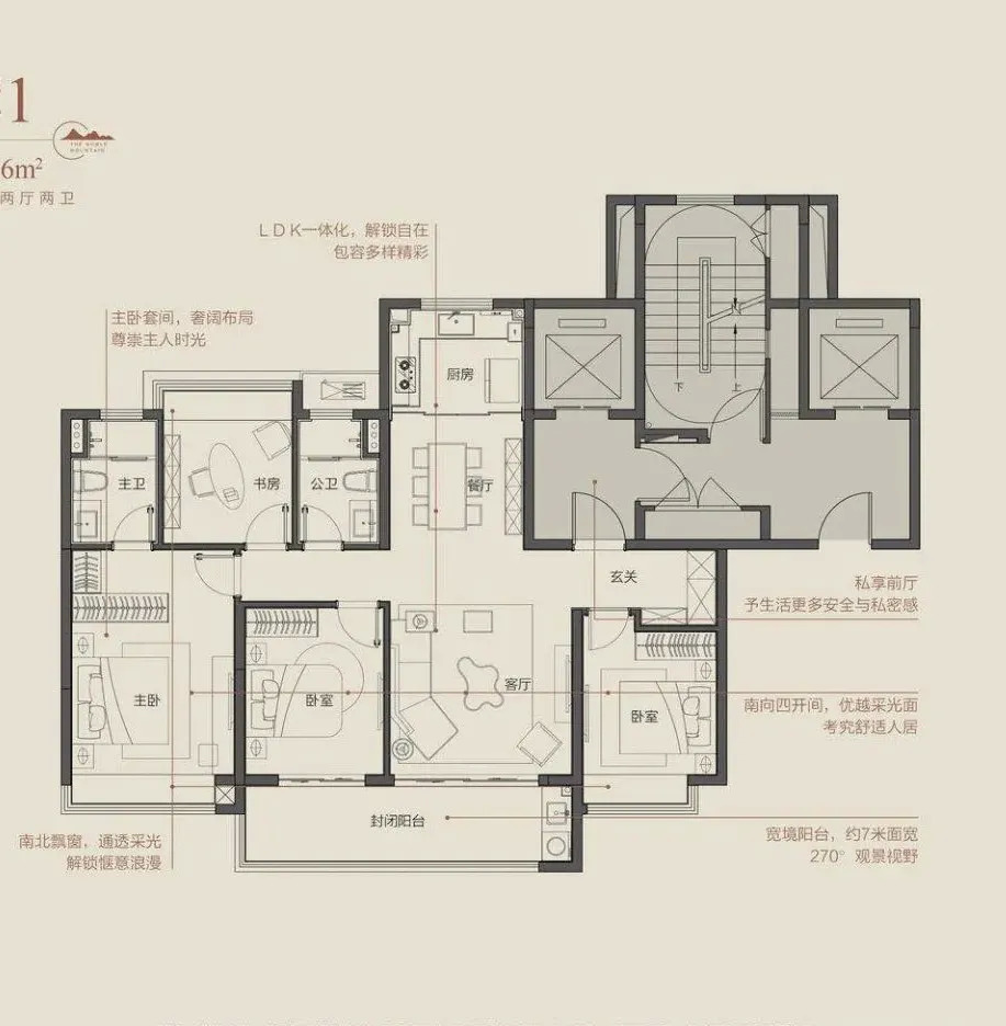 建面约195㎡光幕大平层,五房两厅三卫,约16.7米南向面宽,带来更多的采光、更好的通风,以及更佳的居住舒适度。