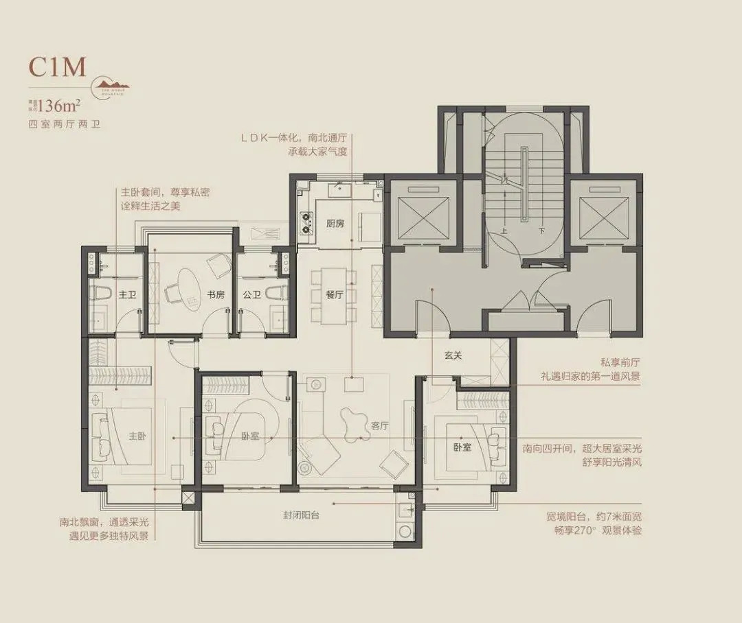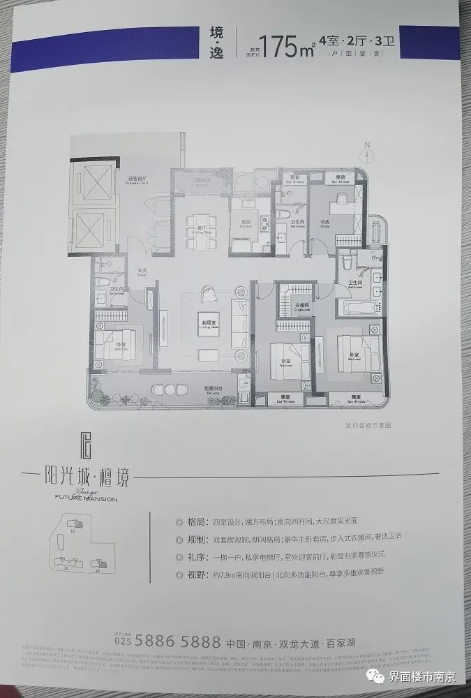 建面约175㎡光幕大平层,四房两厅三卫设计,居家的每一方寸皆是对生活的优化与礼遇。约3.1m层高,采光与视野更佳,彰显豪宅气派,升级生活的想象。南北双向阳台,南向约7.9米阳台承接生活休闲功能,北侧瞰景阳台尽览风光。