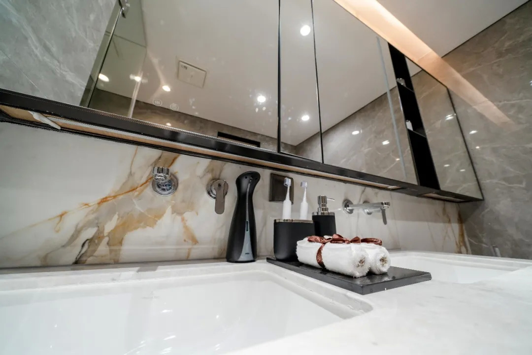大尺寸石材铺面,质地温润,光泽透亮,看上去有高奢酒店的既视感!