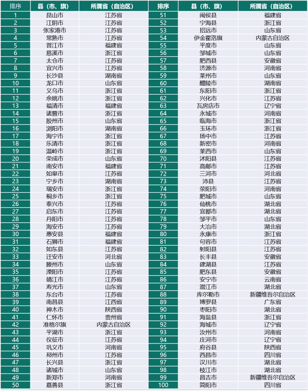 前十名中,江苏省表现抢眼,占到超过一半席位,分别为昆山市、江阴市、张家港市、常熟市、太仓市和宜兴市。