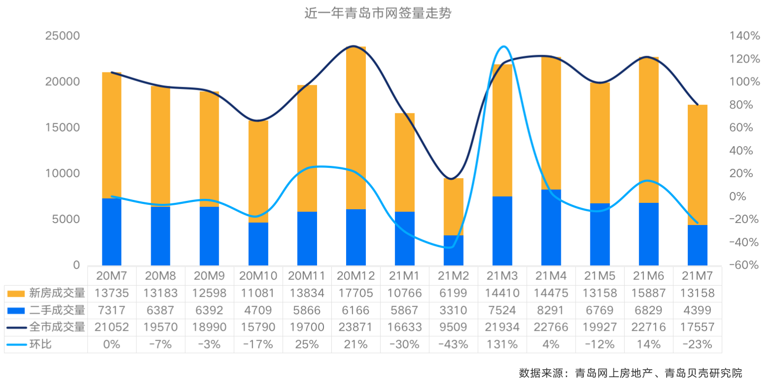 据贝壳研究院统计,2021年7月青岛新房成交量共计13158套,环比下降17.2%;新房住宅成交均价15703元/㎡,环比微涨0.6%。