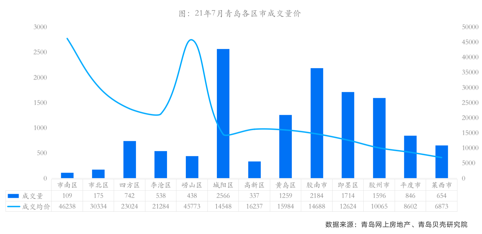例如,城阳区在多盘热销的助力下,7月新房共计成交2566套,新房成交均价14548元/㎡,以明显优势稳居榜首,占比全市总成交量的19.5%。