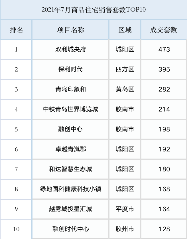 其它区域方面,胶州市7月新房共计成交1596套,新房成交均价10065元/㎡,占比全市总成交量的1212%,位列第4;黄岛区7月新房共计成交1259套,新房成交均价15984元/㎡,占比全市总成交量的9.57%,其中,位于黄岛区的青岛印象和项目单盘成交282套,位列单盘成交榜第3名.