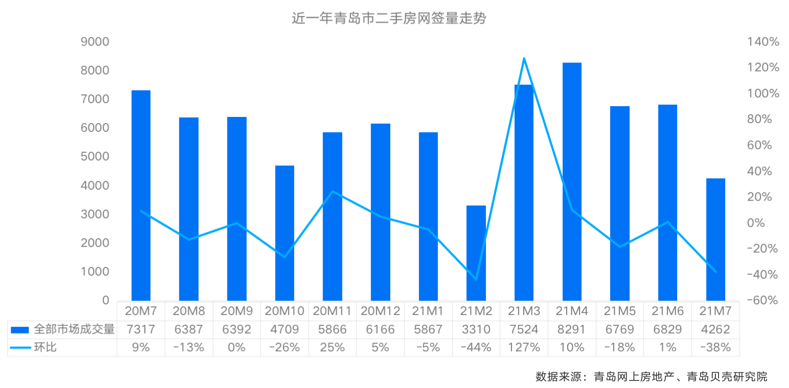 7月二手房市场成交量跌幅近4成。据贝壳研究院数据统计,7月青岛市二手房成交量共计4262套,环比下降38%。