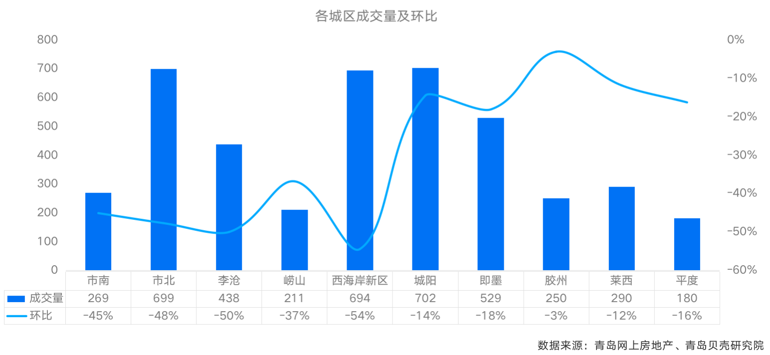 李沧区7月新房共计成交538套,新房成交均价21284元/㎡,占比全市总成交量的4.09%;崂山区7月共计成交新房438套,新房成交均价45773元/㎡,占比全市总成交量的3.33%;市北区7月共计成交新房175套,新房成交均价30334元/㎡,占比全市总成交量的1.33%;