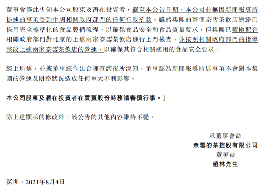 8月4日消息,奈雪的茶公告称,北京两家奈雪茶饮店已立即暂停营业,以便集团进行全面调查,截至公告日期,公司并无因新闻报导所提述的事项受到中国相关政府部门的任何行政罚款。