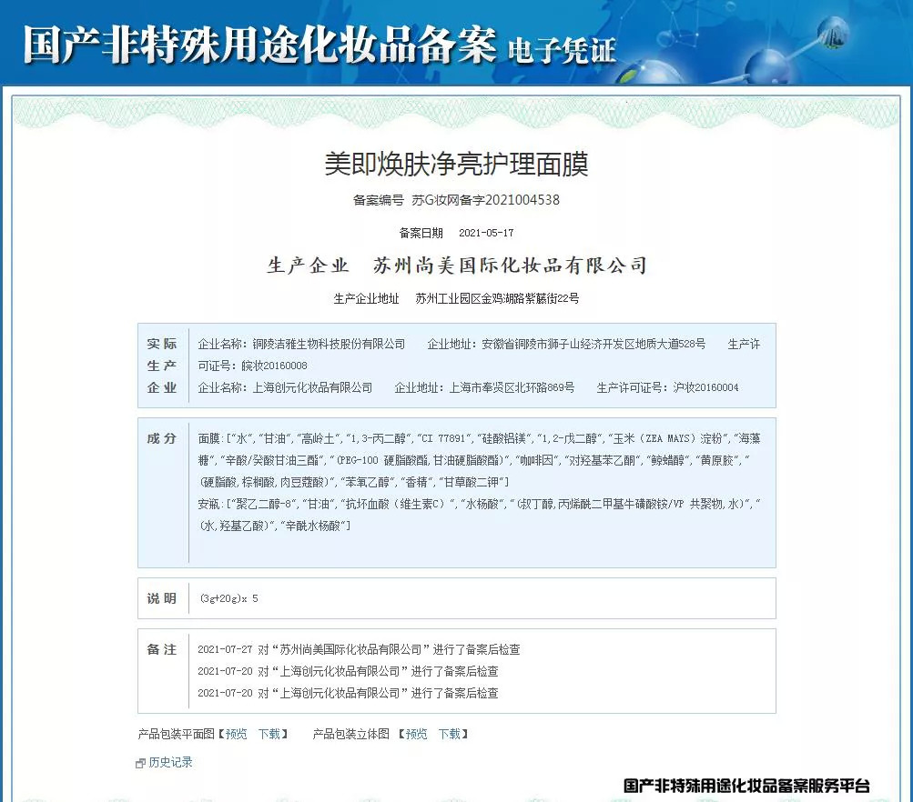 青眼经国家药监局官网查询了解到,美即这一新品于今年5月17日正式获得备案,委托生产企业为苏州尚美国际化妆品有限公司(欧莱雅苏州尚美工厂),实际生产企业为铜陵洁雅生物科技股份有限公司和上海创元化妆品有限公司两家工厂。