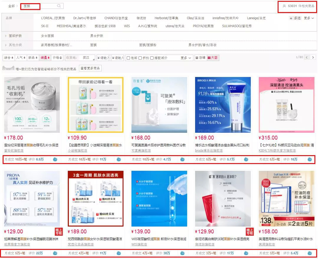 青眼以“面膜”为关键在天猫上搜索显示,共有超5万件相关商品,且排名靠前的雪玲妃、小迷糊、可复美等品牌旗下的面膜月成交量已超过了10万件,且不少是涂抹式面膜。仅以贴片式面膜来看,在销量过万的产品中,多数品牌面膜的单片价格均不超过10元。譬如,月销量超4万件的某品牌烟酰胺水光透亮面膜,售价为99元/20片,单片价格为4.95元;另一品牌旗下的玻尿酸极润面膜,月销量高达6万+,其售价为139元/24元,单片价格为5.79元。