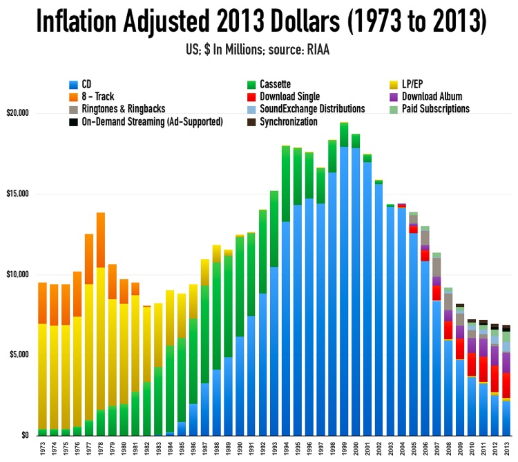 2014年,Digital Music News创始人Paul Resnikoff用一张图表展示了美国音乐产业40年的历史变迁。