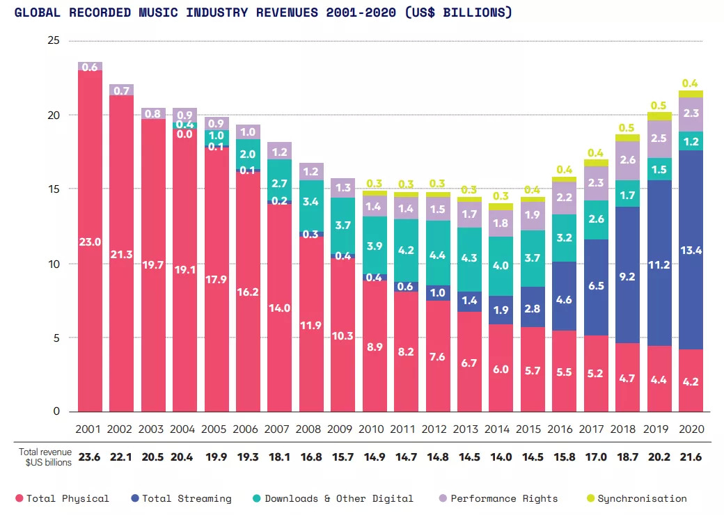 到2020年,全球流媒体收入增长19.9%,达到了134亿美元,占到全球录制音乐市场的62.1%,流媒体在全球48个市场贡献了一半以上的收入,比2019年增加了12个市场。而2020年全球录制音乐市场的整体规模也增长至216亿美元,至此,全球音乐产业回升到接近二十年前的高点。