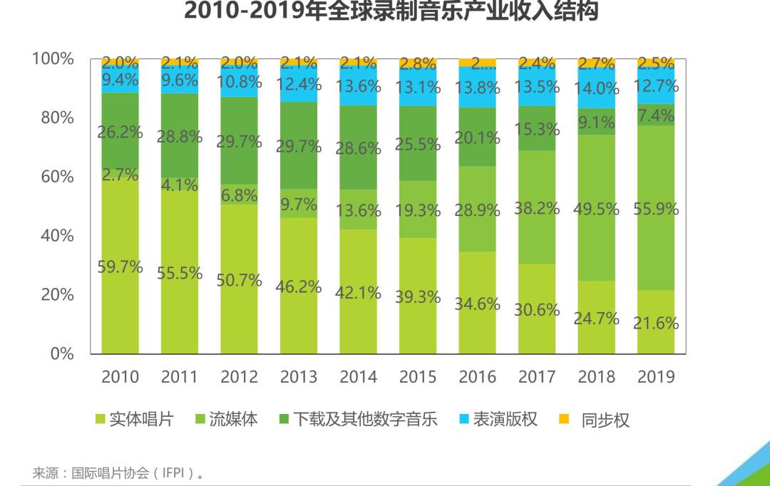 此外,IFPI的数据显示,2019年中国录制音乐收入93%来自流媒体,在线音乐对中国音乐产业的贡献率远远高于全球其他市场。