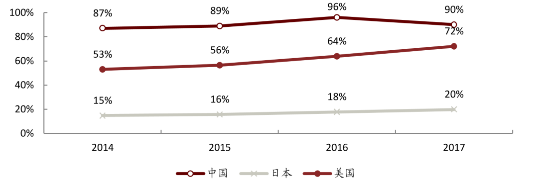(中国、美国及日本音乐市场数字渠道收入占比)