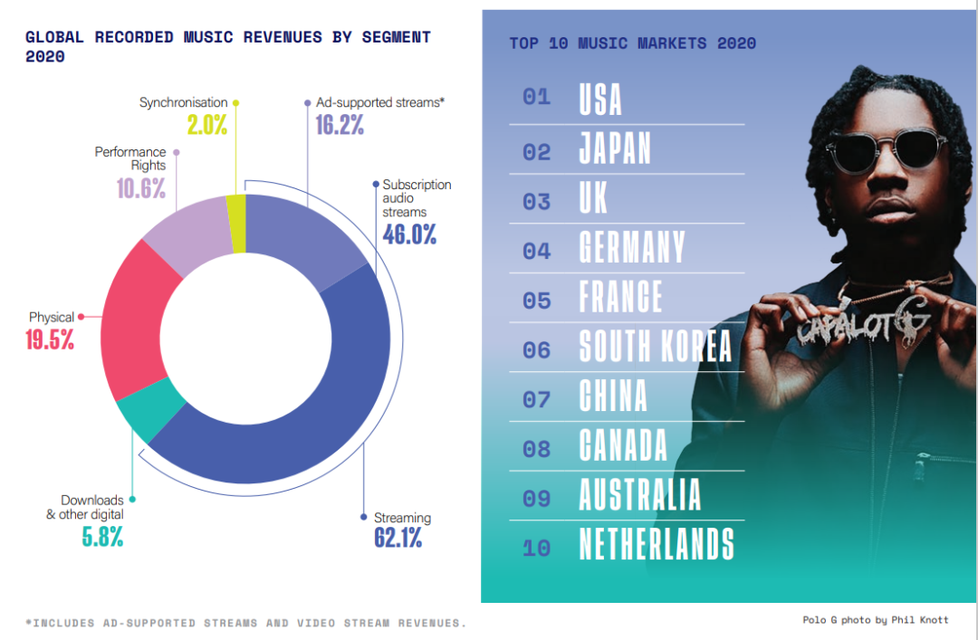 (2020年全球音乐细分市场及区域市场排名,IFPI)