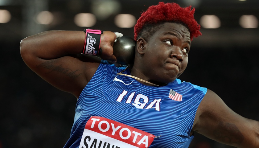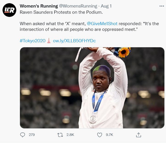 上周日获得女子铅球比赛银牌的美国运动员桑德斯(Raven Saunders)在领奖台上双臂举过头顶交叉,摆成“X”型手势。