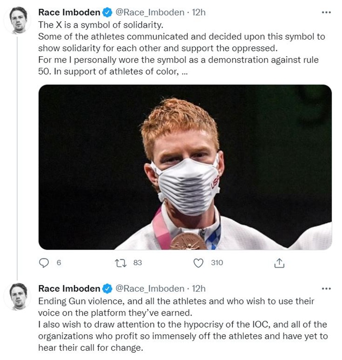 伊姆博登则在Twitter发文,称自己在手背上画“X”标志除了对受压迫群体表示支持外,也是对国际奥委会的“虚伪”表示不满。