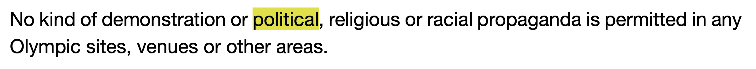 《奥林匹克宪章》明确禁止运动员在比赛场地进行任何形式的政治、宗教和种族示威。