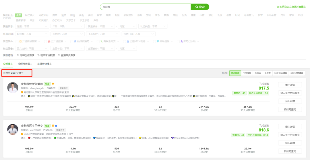 与此同时,医生类KOL(在微博、抖音、B站等平台)也逐渐兴起,就抖音平台而言,在短视频和直播电商数据平台“飞瓜数据”上搜索“皮肤科”一词,就有账号253个。