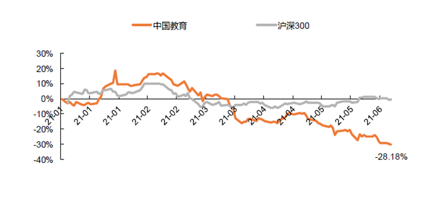 2021 年上半年,教育行业二级市场普跌。据平安证券研究所统计,截至 6 月 11 日,中国教育指数(全球范围内中国教育上市公司)今年上半年跌幅达到 28.18%,与 2020 年度整体涨幅 32% 形成鲜明对比。