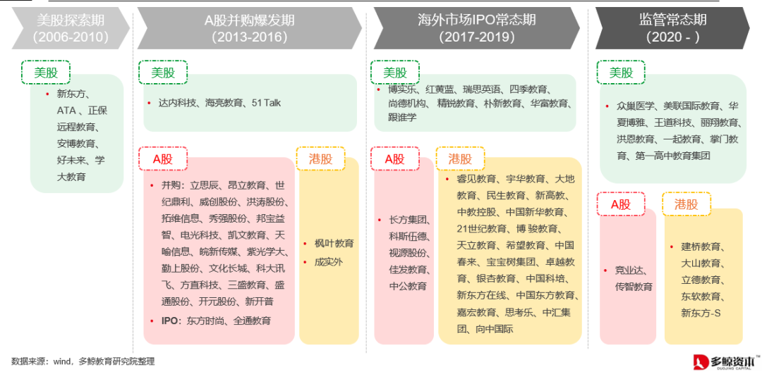 教育行业二级市场发展至今,经历了四个阶段的历程:2010 年以前,教育公司初步试水美股。第一批美股上市企业借助上市迅速扩张业务,也进一步巩固了行业头部的优势;2013 年到 2016 年,A 股并购爆发,为教育行业注入了一波新活力;2017 年到 2019 年,港股、美股IPO 成为常态,教育资产证券化一度成为热潮;而转眼进入 2020 年,短暂的行业高光过后,一系列监管政策重锤落地,教育行业正式迎来监管常态期。