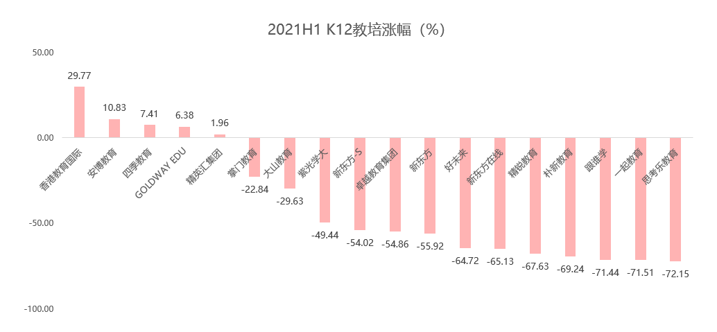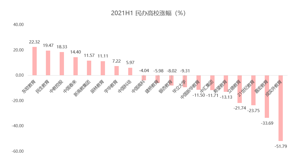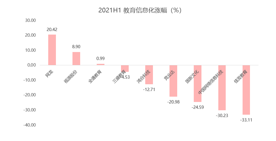 上半年普跌,主要原因有三:第一,受政策影响,在教育公平普惠主旋律下,校外教培监管加强,资本市场普遍不乐观;第二,疫情和政策双重影响下,线上和线下机构的引流、开班均受限,导致业绩出现波动;第三,聚焦在 K12 和职教的一些个股上,如中公教育和内达科技等,去年估值过高而今年业绩不及预期的个股有所回调,拉低了整体表现。
