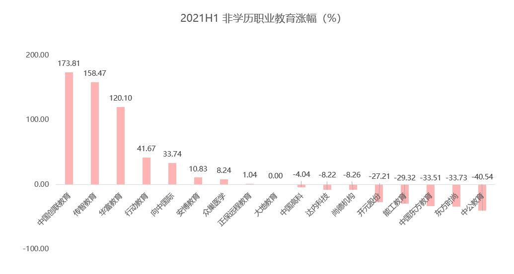 在教育行业二级市场上,非学历职业教育一直是表现较优且稳定的板块,不仅诞生了千亿市值的中公教育,也催生了一批百亿市值、业绩稳定的职教上市公司。但在今年教育行业普跌大背景之下,职业教育板块亦受影响,除了个别表现突出的个股,其他职教公司涨幅不大,总体表现也和 2020 年整年基本持平。