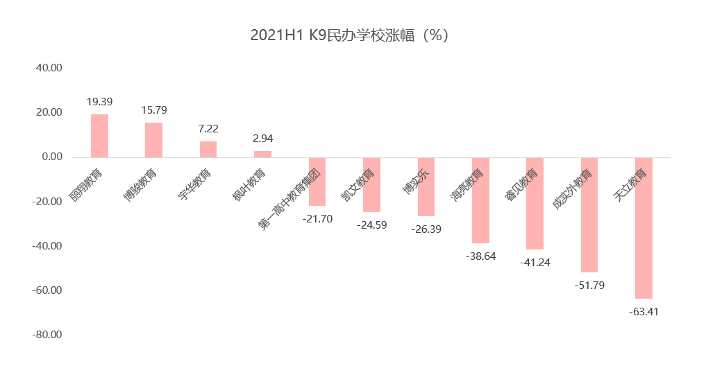先来看高等教育(简称高教)板块。2021 年上半年,对比 2020 年高教板块 7 家涨幅超过 30%、最高涨幅接近 170%,高教板块回落明显,恐受限于教育板块整体估值回落造成的影响及部分高教业绩未及预期。但以整体涨幅论,相较 K9 民办学校和 K12 教培等其他板块,高教涨幅更大。