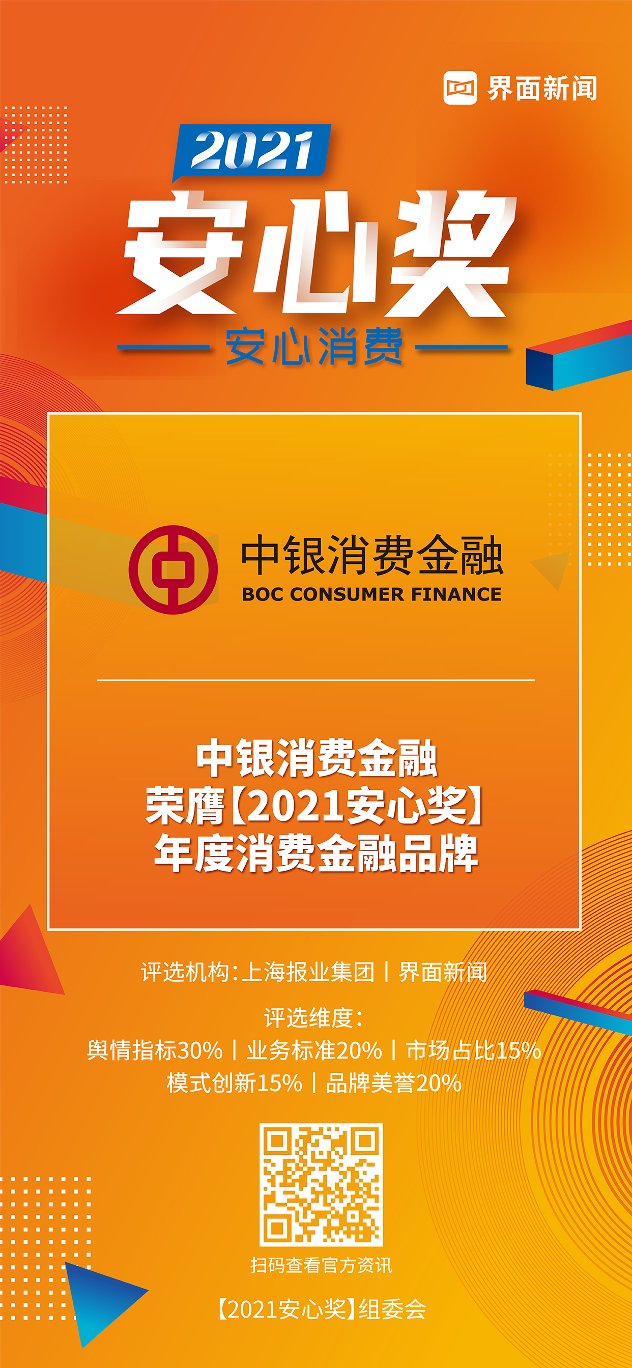 8月5日,上海报业集团|界面新闻在上海静安瑞吉酒店举办了【2021安心奖】颁奖典礼,并正式公布了本年度获奖名单。围绕“安心消费”这一核心价值,来自生活服务、家电、家化、美妆护肤、食品、乳品、饮品等领域优秀企业,突破重围,斩获年度大奖Top40。中银消费金融以其高质量的消费融资服务和不断回馈社会的担当,荣膺年度消费金融品牌。