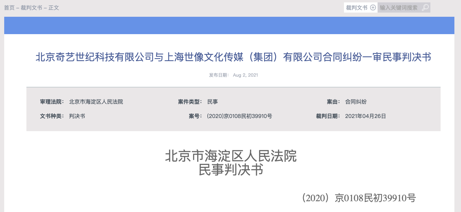 据天眼查APP显示,8月2日,北京法院审判信息网公开北京奇艺世纪科技有限公司与上海世像文化传媒(集团)有限公司合同纠纷一审民事判决书,案号(2020)京0108民初39910号,审理法院为北京市海淀区人民法院。
