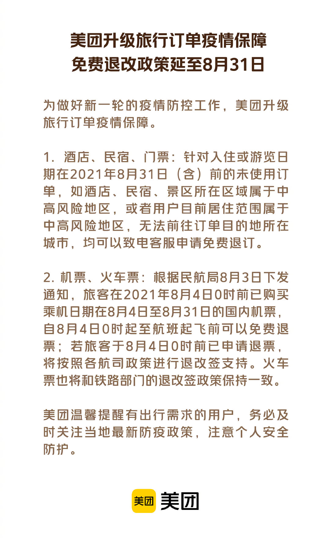 8月5日午间,美团在其官方微博发布公告称,为做好新一轮的疫情防控工作,美团升级旅行订单疫情保障: