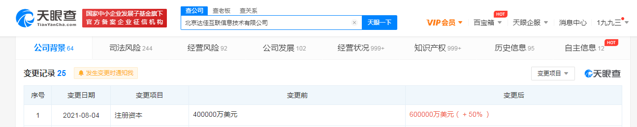据天眼查APP显示,8月4日,快手关联公司北京达佳互联信息技术有限公司发生工商变更,注册资本由40亿美元增至60亿美元,增幅50%。