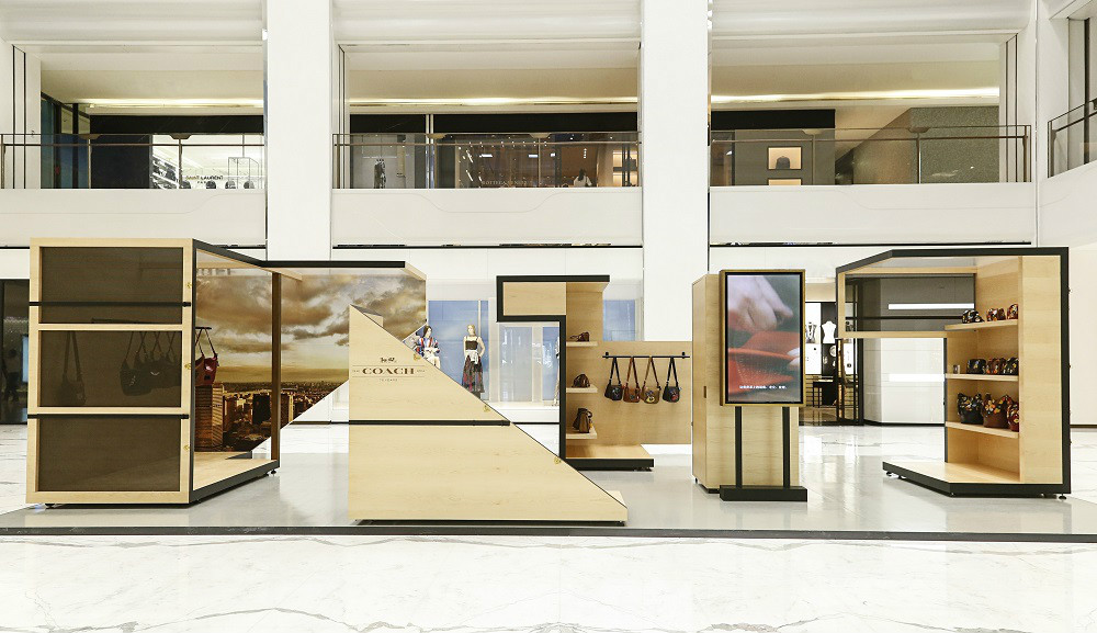 北京SKP购物中心的一层,Coach 搭起来一个临时的木质空间——这家游击店只会持续一周,店内摆着若干只复古包包,用的是回收回来的旧包加上新的五金和流行元素制成。