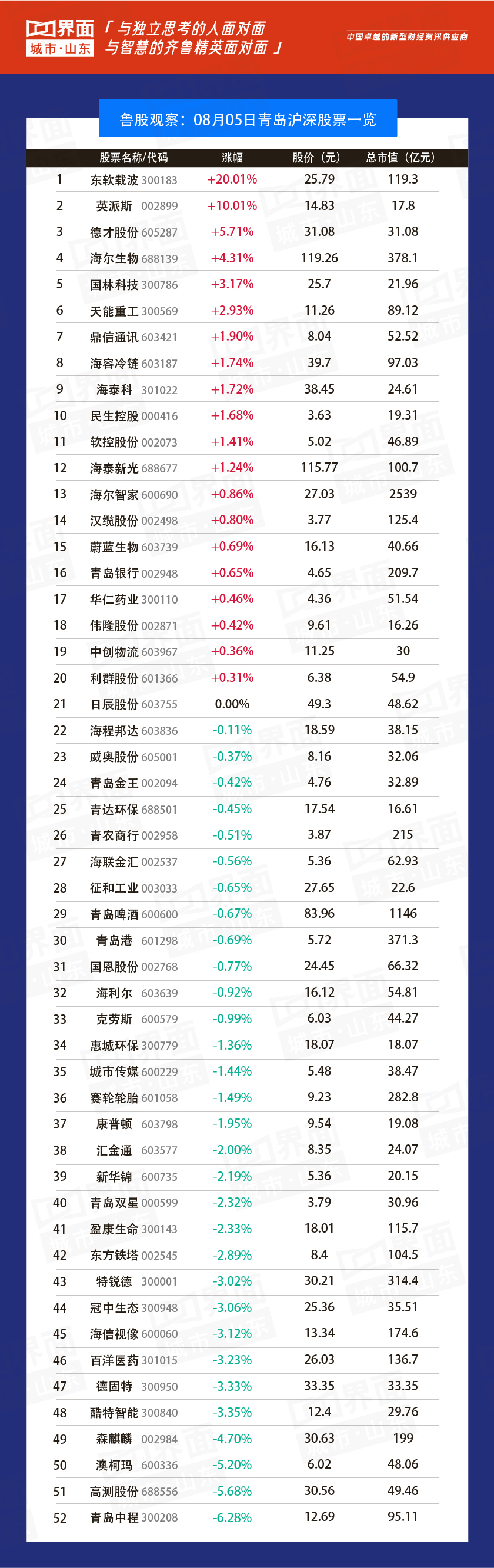 青岛市涨幅榜首:东软载波(300183),涨幅20.01%,股价25.79元,总市值119亿元;