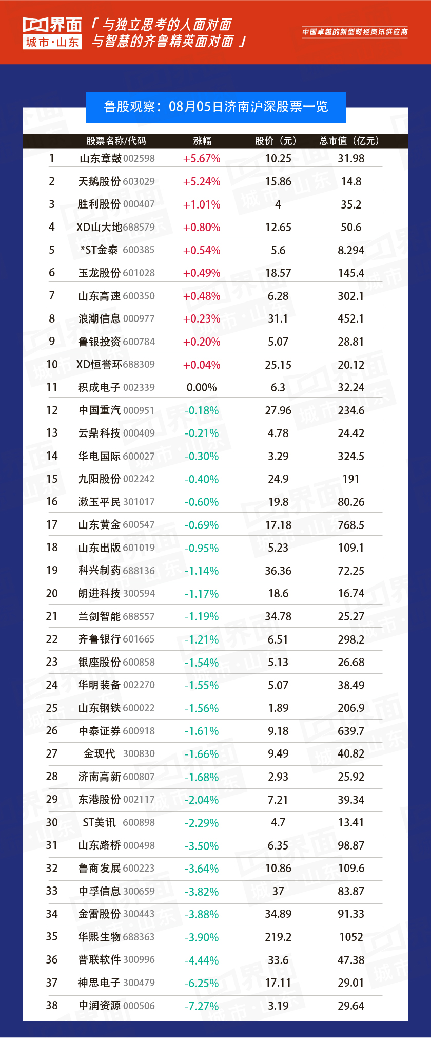 济南市涨幅榜首:山东章鼓(002598),涨幅5.67%,股价10.25元,总市值32.0亿元;