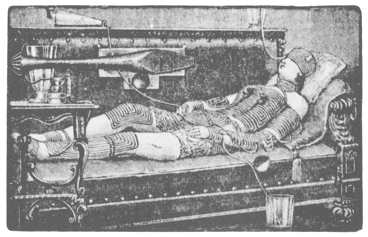 在这一意义上,躺平这个姿态通向未知的潜意识深渊。十九世纪末,躺卧成为了一种时尚的理疗方式,用来治疗神经衰弱、歇斯底里症及一般的身体虚弱。在托马斯·曼的《魔山》里,主角躺在阳台上的精美椅子中,畅享山居疗养的宁静时光,水平躺卧成为了存在本身。躺椅也成为了心理分析的工具,甚至是心理分析的近义词,甚至有躺椅商品被命名为“弗洛伊德”。患者躺在心理医生的躺椅上,陷入昏迷的状态,容许医生进入他们的最深层幽微的内心世界。心理分析躺椅是人们创造出的许多可调节卧具中的一种,一方面人们将卧具用于许多领域和场景,比如手术、理发和分娩等等;另一方面,表现睡眠、梦境和迷醉元素的艺术品也出现了。在创作于1921年的作品《用肢体调制胶水》里,画家马克思·恩斯特借用医学文献中的热疗图展现了躺卧者的受控:一些细管正将液体从她的身体里导出,又有一些东西正在导入她的身体,这或许也寄托了现代人对于技术操控躺卧和睡眠体验的反思。